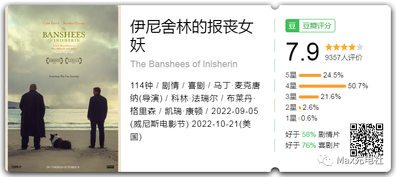在IMDb平台,《伊尼舍林的报丧女妖》的观众评分也拿下了8.2分,豆瓣平台的最新评分为7.9分,而MTC平台的评分则为87分。