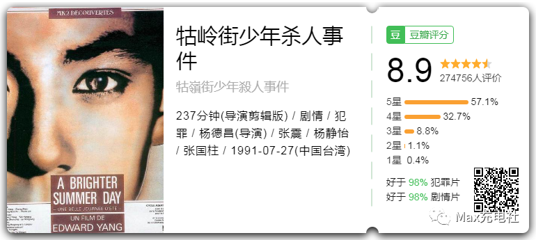 《牯岭街少年杀人事件》(1991)是杨德昌的创作生涯经典中的经典,电影藉一桩1961年的真实少年杀人案(茅武杀人案)为底本,以中学生小四(张震)的故事开展,牵出整个60年代的台湾省社会图景,慢慢导引至结尾具毁灭性的一刀。
