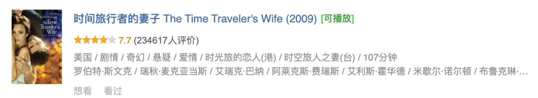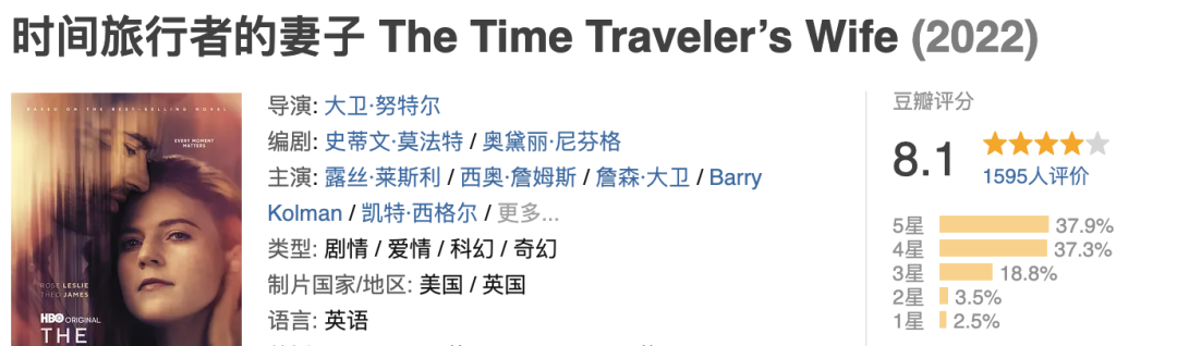 剧版《时间旅行者的妻子》由HBO出品,一共6集,豆瓣评分8.1。
