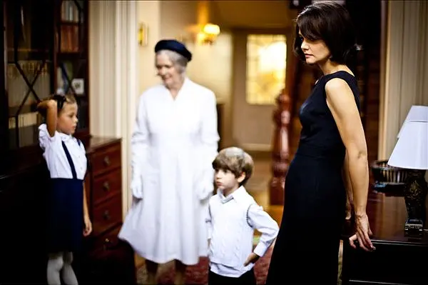 “阿汤嫂”凯蒂·霍尔姆斯在剧中时而穿着高贵的礼服,时而穿着花裙和格雷戈-金尼尔搭肩暧昧,时而又穿着白衣大展温婉,在造型上与原型有七分神似,颇有当年第一夫人的风范。