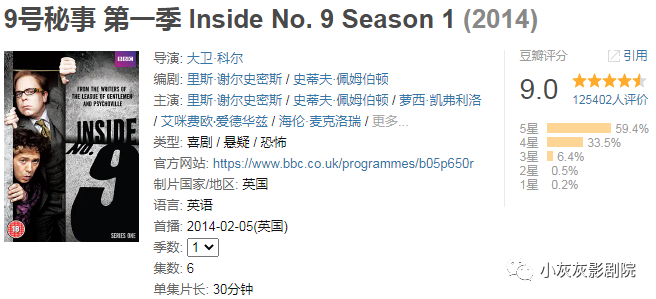 记得《疯城记》吗?Reece Shearsmith和Steve Pemberton再度携手归来,联合BBC推出这部暗黑喜剧《Inside NO.9》,关于片名,主创在一次采访中提到这完全是随机想到的一个名字,原本也不是9这个数字,后来觉得9更加顺口才采用了... 该剧与《黑镜》的结构类似,一集一个故事,每集的故事都是独立的;看过《疯城记》的人应该都为二位的演技所折服,相信此次的6个新故事也不会令人失望……