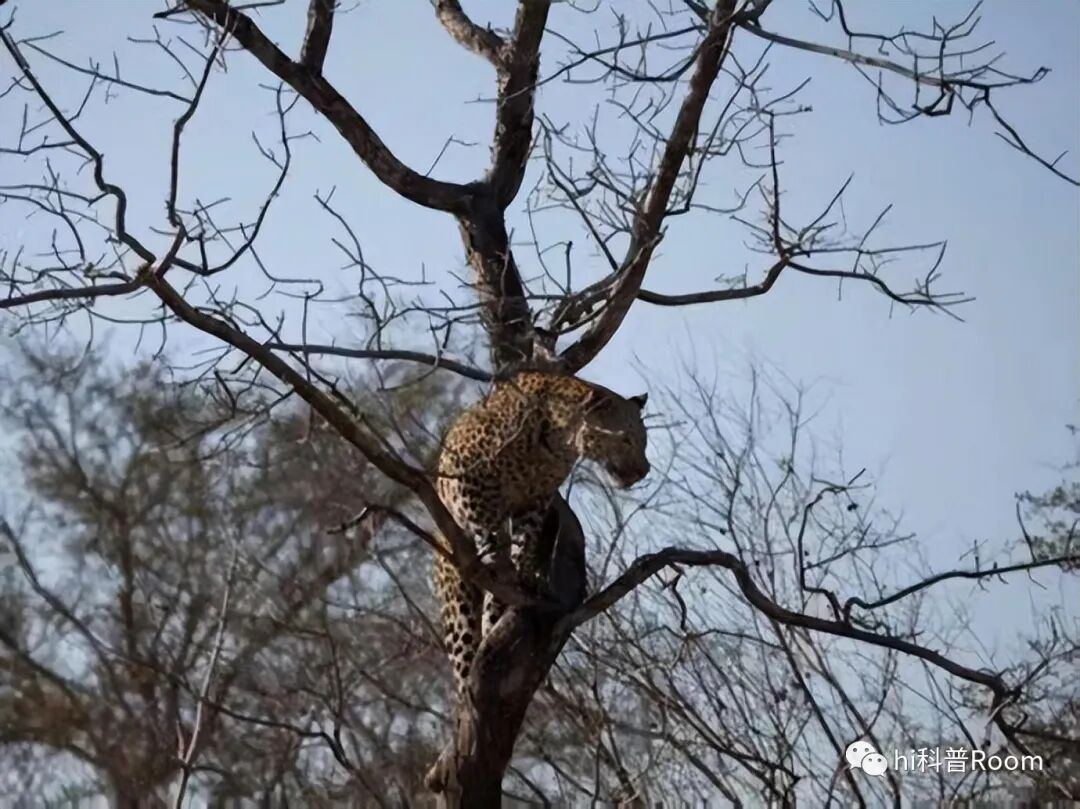 野犬家族有时也会仗着数量优势欺负独来独往的花豹,常常把花豹堵在树上,一副恨不得把花豹拖下来痛扁一顿的样子。而花豹因为数量不占优势,也常适当认怂保健康。因为野犬不会爬树,所以也只是在原地蹦跶一会,等它们没了兴致,就自然会离开了。