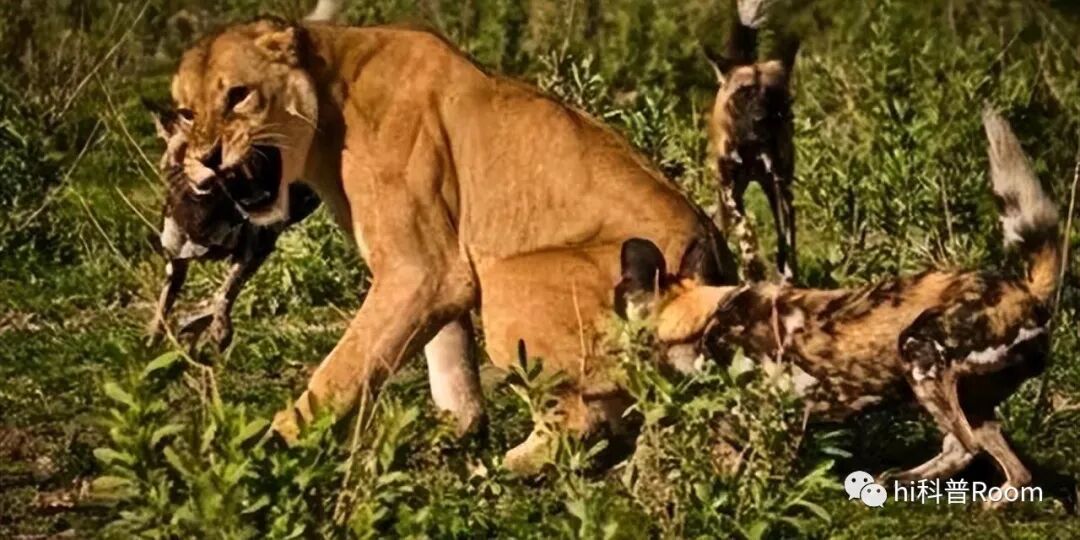 不过野犬家族也有飘的时候,有时还会拿狮子练练胆。有时野犬会因为食物缺乏等原因,进入狮子的地盘,在狮子的眼皮子底下悄悄捕猎,不过虽然成年野犬可以在被狮子发现时,凭借着自身速度的优势与狮子斗上一番躲避狮子的攻击并成功逃离,但其幼崽还是很容易成为狮子口中的“亡魂”的,毕竟野犬幼崽在面对狮子时,就如同砧板上的鱼肉,只能任狮子宰割。