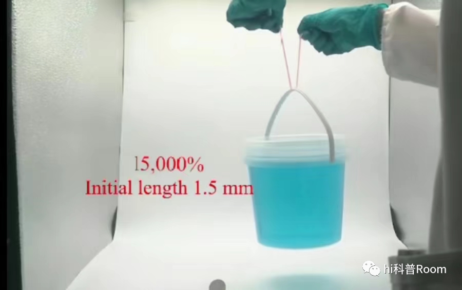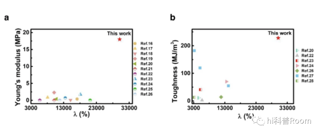 因为这种材料在设计中,其拉伸性、刚度、韧性和抗疲劳性相比于普通的“人工韧带”材料有了很大的突破。根据官方得出的数据:弹性体可承受30000 %的拉伸,杨氏模量为18 MPa,韧性为228 MJ m-3,疲劳阈值高达2682 J m−2。这样讲,大家可能看不懂,总而言之,这种材料优于所有已报道的合成弹性体。