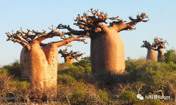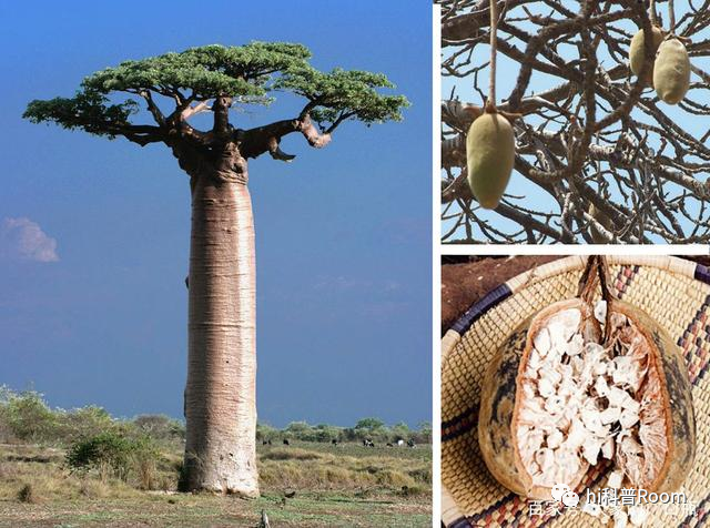 猴面包树的果实中,维生素G的含量是橙子的三倍,钙含量是菠菜的一半,是重要的抗氧化剂来源,具有降低癌症、心脏病等各种疾病危险性的成分。这种超级水果,以前要到非洲才能买到,最近欧盟批准了食品监管,在附近的超市也能够买到。猴面包树是非洲风景中不可缺少的树。之所以被称为“倒栽树”,是因为它的头插在地面上,树根似乎伸向天空。非洲人也把猴面包树称为“生命之树”。树干的周长可达15米,一棵树可以储存约4500公升的水。从树皮中可提取制作绳索和衣服的纤维,有促进免疫系统的效果,因此新鲜的叶子也很受欢迎。树的后面是可以藏40人的避难所。