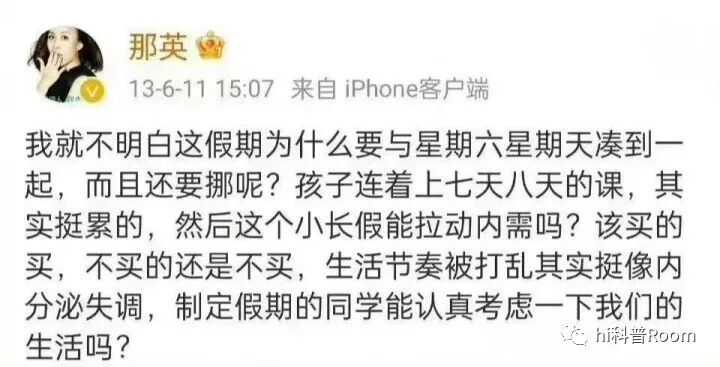 而且近些年来严重的加班和调休制度,一次就要上7天班,让我们一到小长假的规划往往不是出去旅游“放松”,而是在家补觉,免得加班猝死。针对国内的现状,我觉得专家们在制定放假规定的时候还是应该实事求是,眼里不能只有经济发展,更不能忽视人民群众的情绪和意见。当初我们在99年调休以前,刚刚温饱的中国人上下一心,都想着好好赚钱,再苦再累也没有怨言。但是随着人们经济水平的提高,放假、休息和健康在大家心中的分量开始增加,当时增加节假日的做法是非常明智的,符合经济发展规律的。