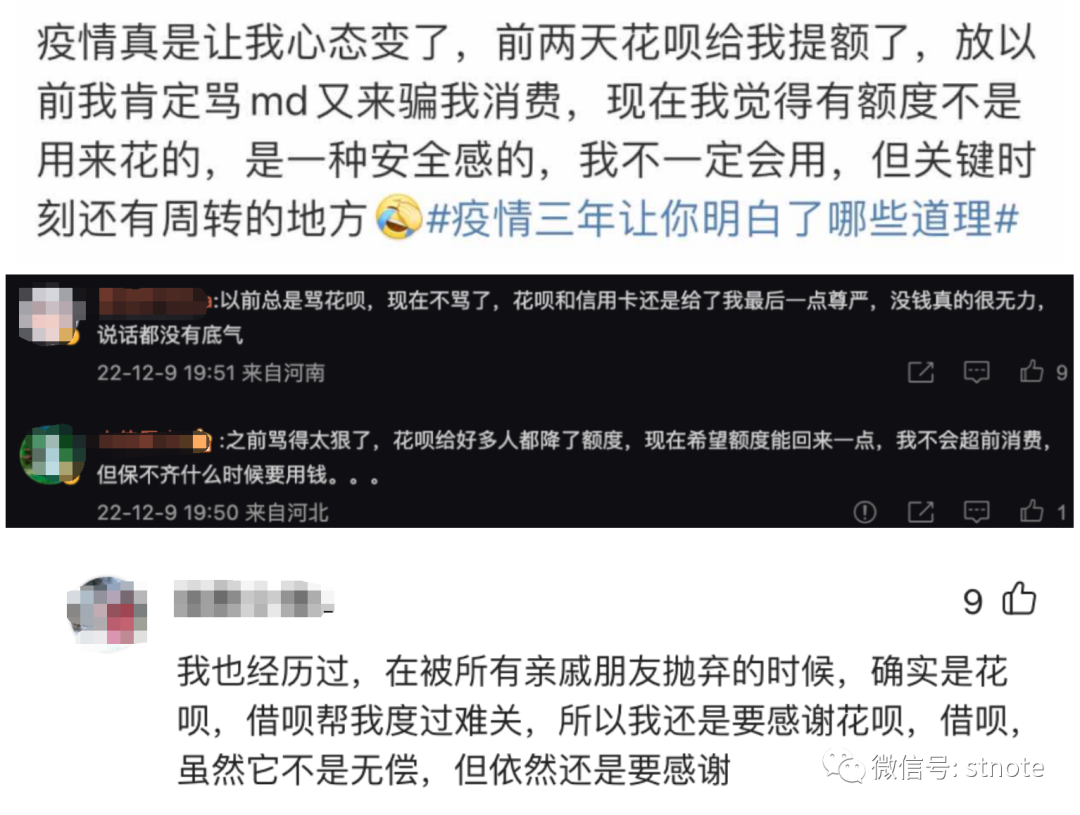 但就在三年疫情结束后,风向突然发生了变化,有人说以前自己骂花呗骂得最狠,疫情后不会再骂了,甚至还感谢花呗给自己提额,因为现在知道有额度并不是用来花的,而是赋予的一种安全感。