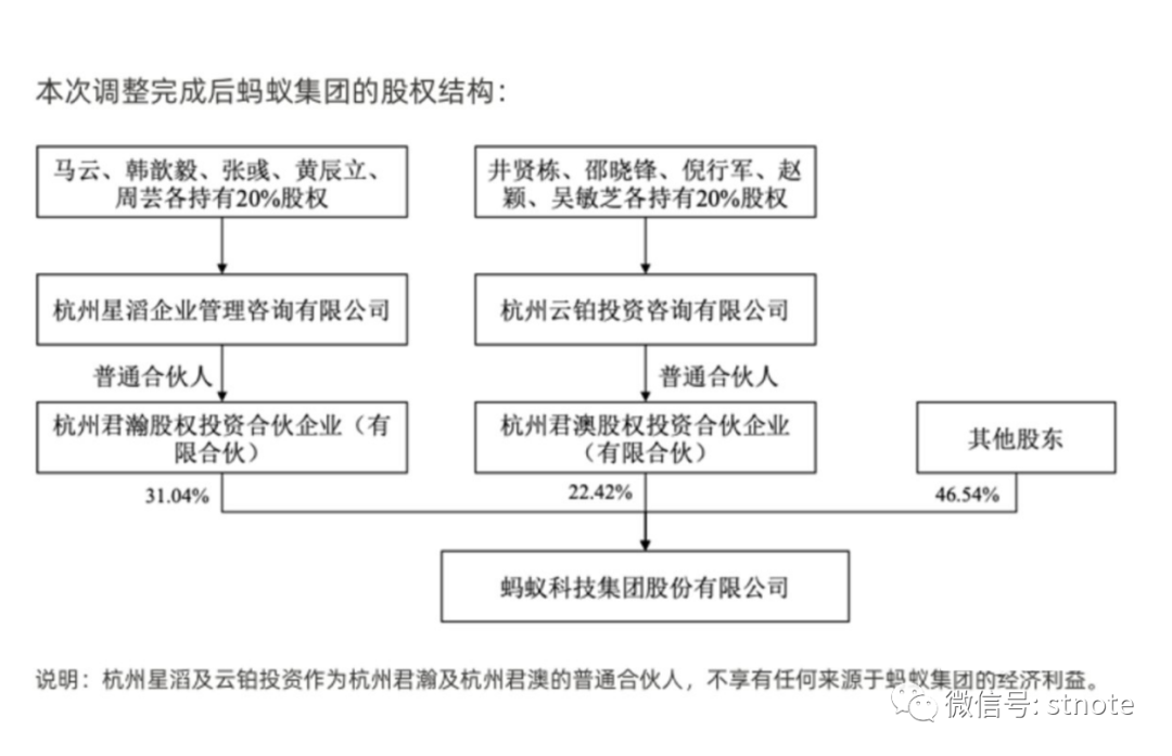 在这次升级变动之前,马云及井贤栋、胡晓明、蒋芳等一致行动人共同行使股份表决权,马云能够实际支配云铂投资股东会,从而获得蚂蚁集团53.46%股份的表决权。