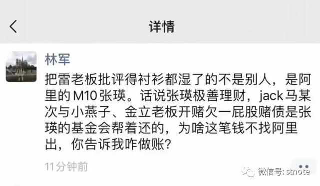 林军称,把雷军批评得衬衫都湿了的人是马云的妻子张瑛。而这位消息人士林军,在互联网行业也是非常有名,所以在朋友圈发出去之后,很快就扩散到了互联网。