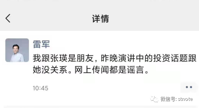 不过结果却很打脸,次日上午雷军便在朋友圈亲自辟谣了,他在朋友圈说,自己跟张瑛是朋友,演讲中的投资话题跟她没有关系,网上的传闻都是谣言。