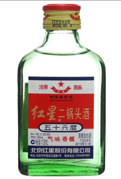 红星二锅头,这款酒外观呈现墨绿色,看起来没有什么很特别的地方。