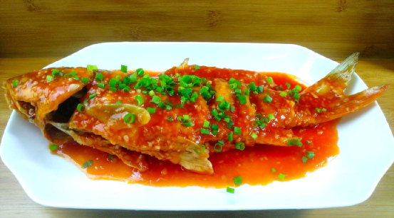 这是一道比较常见的家常菜,也是鲁菜中的特色名菜。糖醋鱼以鱼为主要材料,鱼肉炸2分钟左右捞出,锅中放入葱姜蒜末、酱油、醋,香味炒出后,再放入骨头汤、白糖、淀粉等烧制成糖醋汁,最后迅速又均匀淋到鱼身即可。这道菜外焦里嫩,肉质鲜美,酸甜可口,特别下饭,连盘子里的汤汁,都不会留下一滴。