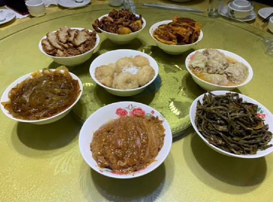 “正定八大碗”,顾名思义,就是指8个菜,分别是由4个荤菜和4个素菜组成,菜品一般是扣肉、酥肉、扣肘、方肉,豆腐、海带、粉条、萝卜,因为这道菜正定做得最正宗,所以,人们就将它叫做“正定八大碗”。