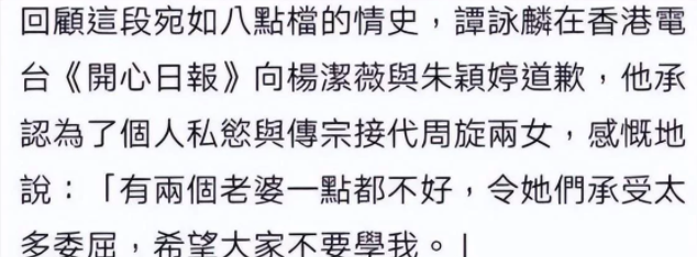 多年后谭咏麟在节目上承认,自己当年为了传宗接代和个人私欲伤害了两位女性,让她们受了多年的委屈,还说同时有两个老婆其实一点也不好。