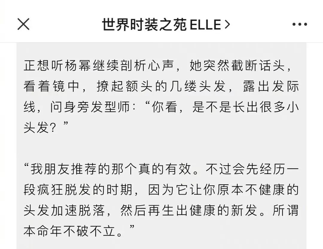 采访里,杨幂还透露生发液是她朋友推荐,很有效果。她表示:不过会先经历一段疯狂脱发的时期,因为它让你原本不健康的头发加速脱落,然后再生出健康的新发。