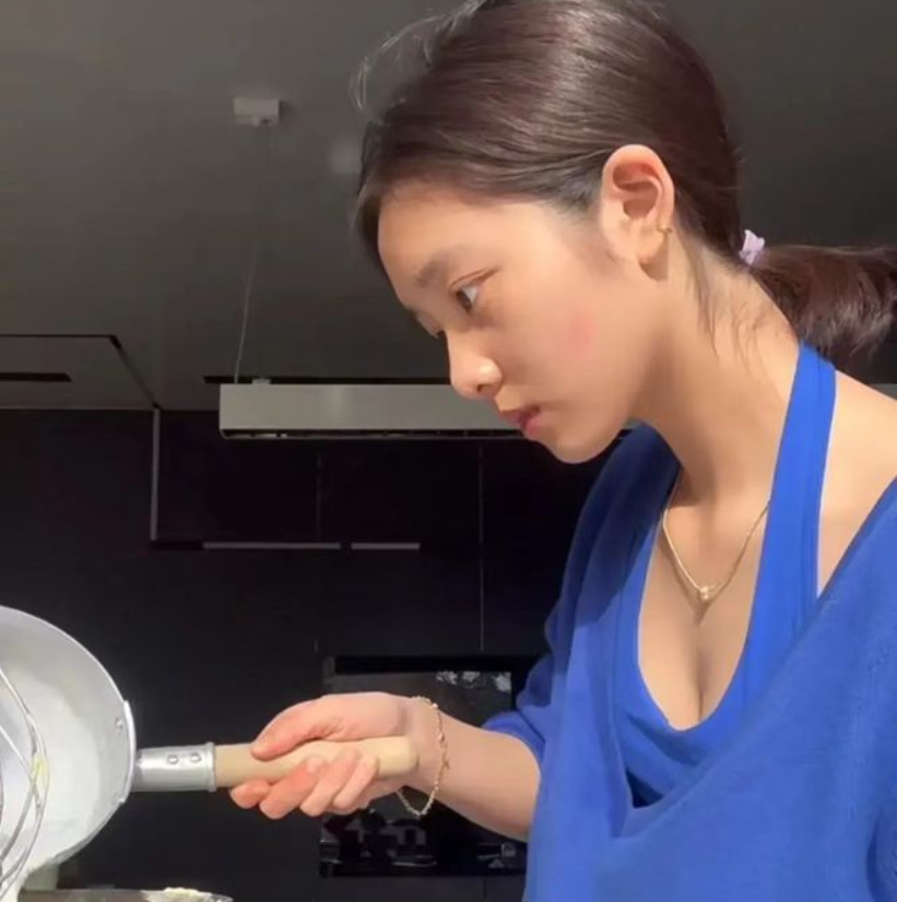 她晒出了一条自己做甜品的视频,视频中,16岁的黄多多穿着蓝色大领口的外套,衬得她皮肤十分白皙水嫩。