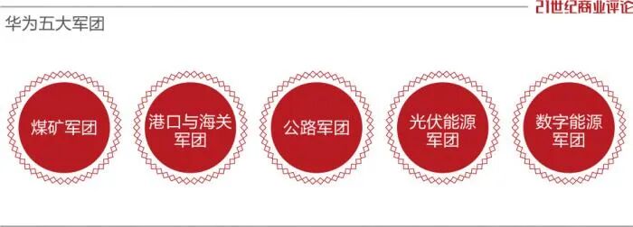 在调整业务板块方面,华为去年成立了“五大军团”:煤矿军团、港口与海关军团、公路军团、光伏能源军团、数字能源军团。