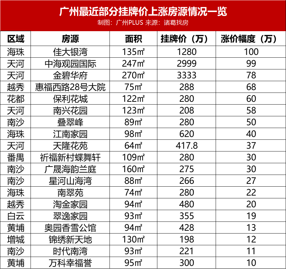 这些涨价的房源从核心区的天河、海珠、越秀到次外围区的黄埔、番禺、·白云再到外围区的增城、南沙、花都均有。
