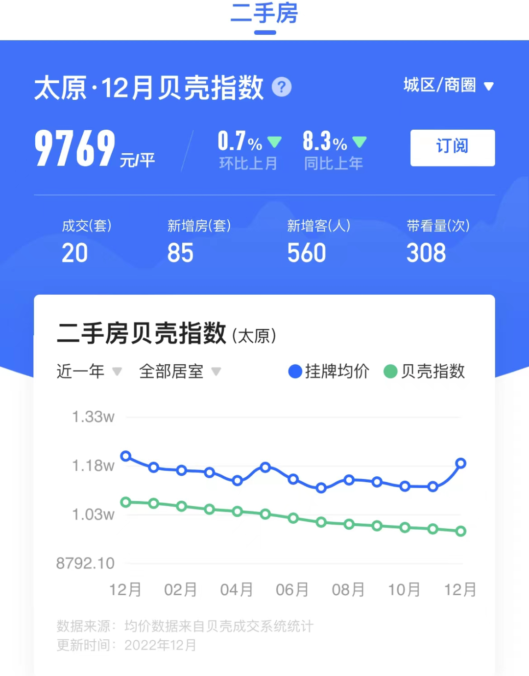 根据贝壳找房披露,当下太原的二手房均价为9769元/平方米,较上年同期下跌了8.35%,环比上月下跌了0.7%。