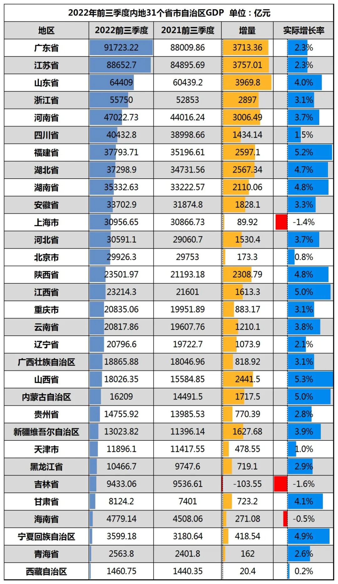 从各省市情况来看,31个省市自治区中,前三季度GDP增速,有三个负增长,两个在1%以下,两个在2%以下,六个在3%以下,八个在3%以下。