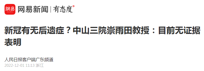 12月1日,人民日报客户端广东频道发布消息:目前学界并未确认新冠肺炎有后遗症。至少尚没有证据表明有后遗症。