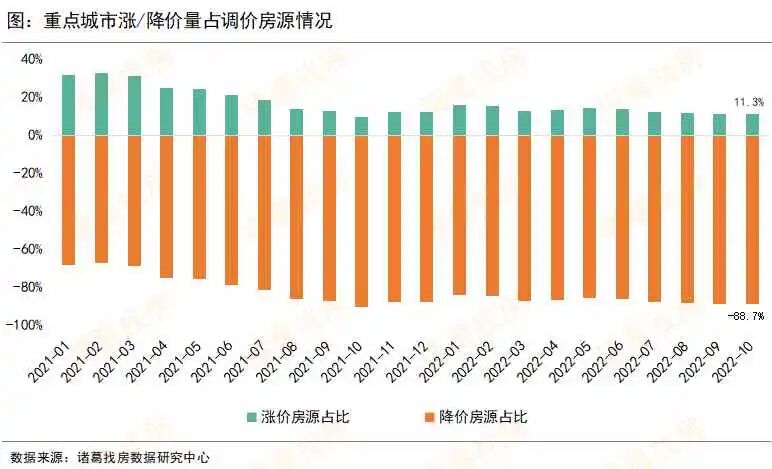 中心城市方面,诸葛找房数据研究中心披露的10月份10个重点城市数据显示,目前几乎有80%的二手房房源在降价出售。