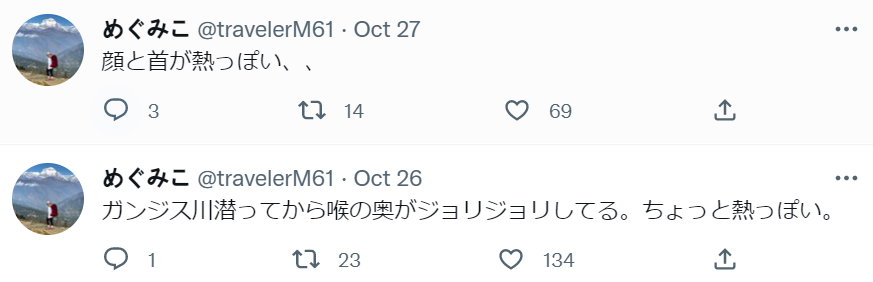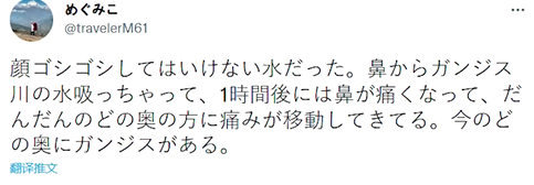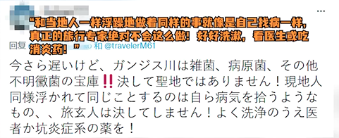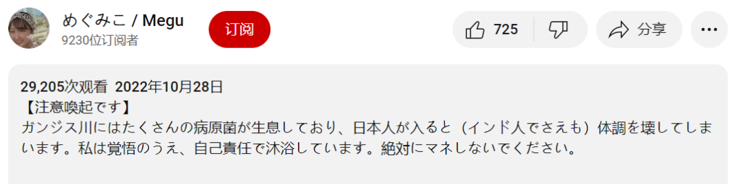 Megu在视频简介中告诫大家:恒河水中有很多病原菌,日本人(就连印度本地人)泡进去身体都会出问题,她自己做好了生病的觉悟才去的,请大家千万不要随意模仿她。