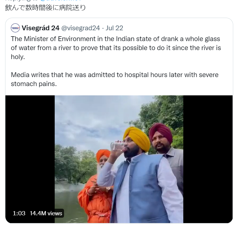 之前还看过一个新闻,男子喝了一瓶印度某河水,结果喝完没几小时就送医院了。