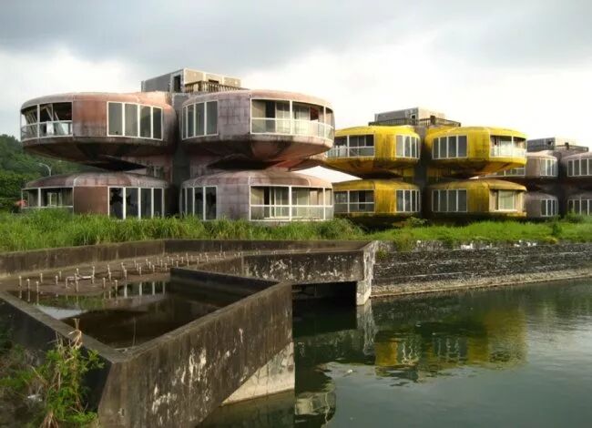 三芝飞碟屋,中国台湾。飞碟屋是在1981年开始建造的,因当时地主看好海滨度假风潮,想把他打造成度假胜地的一部份,但周转不灵而停工,而施工时由于道路刚拓宽,曾发生数起死亡车祸,坊间流传是怨灵作怪,飞碟屋荒废至2008年被才被新北市政府拆除。