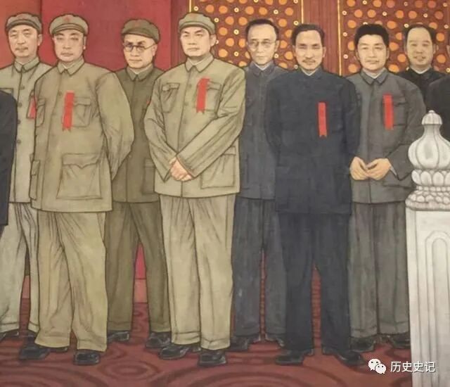 还有,这幅画明显参考了画家董希文的经典画作《开国大典》——在董希文的《开国大典》里,主席身后第一排有朱德、刘少奇、宋庆龄、李济深、张澜、高岗;第二排是周恩来,傅作义,高伯钧,刘格平等人。