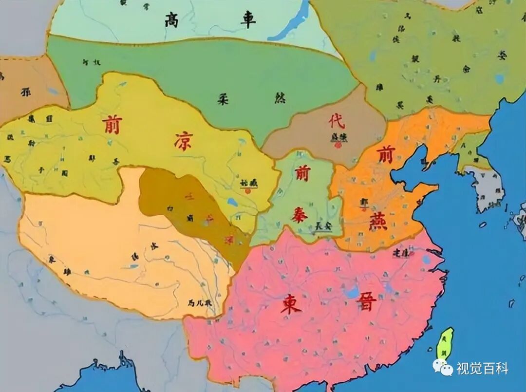 五胡十六国,(304~439年),是中国历史上的一段大分裂时期。该时期自304年李雄和刘渊分别在汉地巴蜀建立成国(成汉)、在中原建立汉赵(前赵)时起,至439年北魏太武帝拓跋焘灭北凉为止。东晋十六国时期,汉地江南、荆湘地区由东晋控制,而汉地北部和西南部则先后建立了二十多个国家。其中的前凉、成汉、前赵、后赵、北凉、西凉、后凉、南凉、前燕、后燕、南燕、北燕、夏、前秦、西秦、后秦十六个国家实力强劲,"十六国"之称源出于北魏史学家崔鸿所撰的《十六国春秋》:"五凉、四燕、三秦、二赵,并成、夏为十六。"范围大致上涵盖汉地中部、东部、西南部、西部,最远可达漠北及西域。