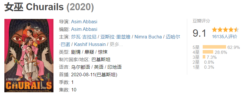《女巫》是一部巴基斯坦原创网剧。因为触及到了童婚、性骚扰、虐待、强迫婚姻、种族主义、阶级不平等、同性恋等等痛点议题,一经播出便在巴社会上引起了热烈反响。它不仅被当地一家著名媒体评价为“女权主义杰作”,还在IMDB上更是获得了8.6的高分。