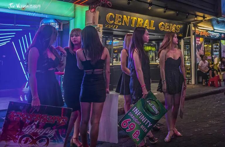 步行街上,路边泰国女人站成一排,手里拿着一个牌子,上面所有的服务内容全部都是明码标价,没有任何掩饰。