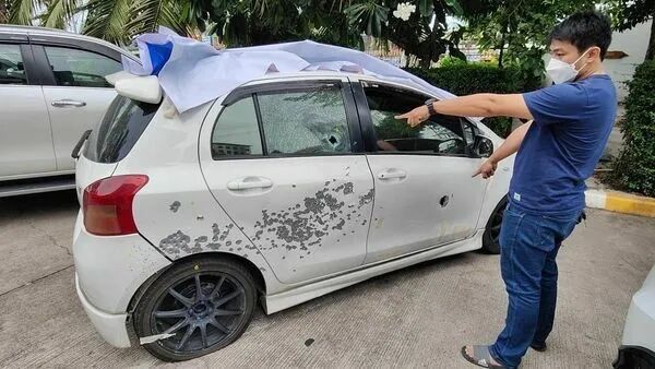 天要亡我?不,机智灵敏的Teerapan赶紧借助汽车这块巨大的铁皮护体,成功逃离了枪击现场。