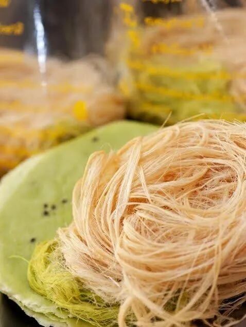 这两天又被泰星Lisa带火了一道泰国甜点。这个甜点颜色鲜艳,形状像一根根头发丝儿,入口即化,甜得要S。它就是原产自泰国大城的著名甜点Roti sai mai(โรตีสายไหม)。