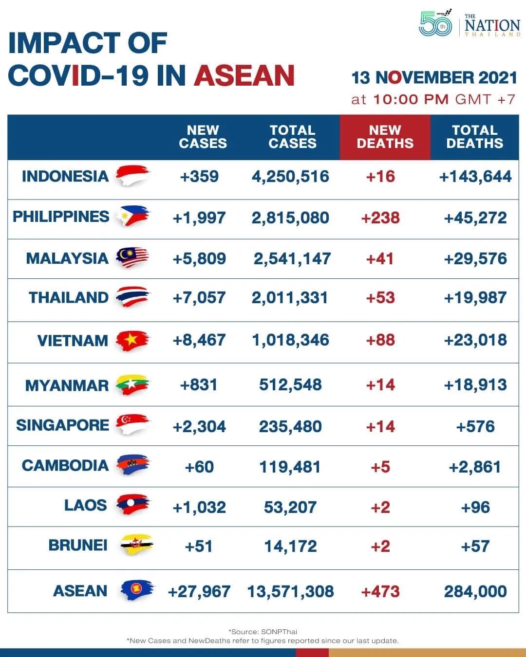 相比周五的数据,周六的数据显示东盟国家新冠新增人数有所减少,但是死亡人数上升了。(周五是30512新增,409死亡;周六是27967新增,473死亡)。