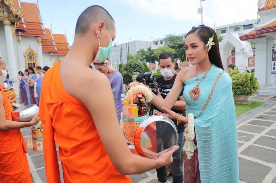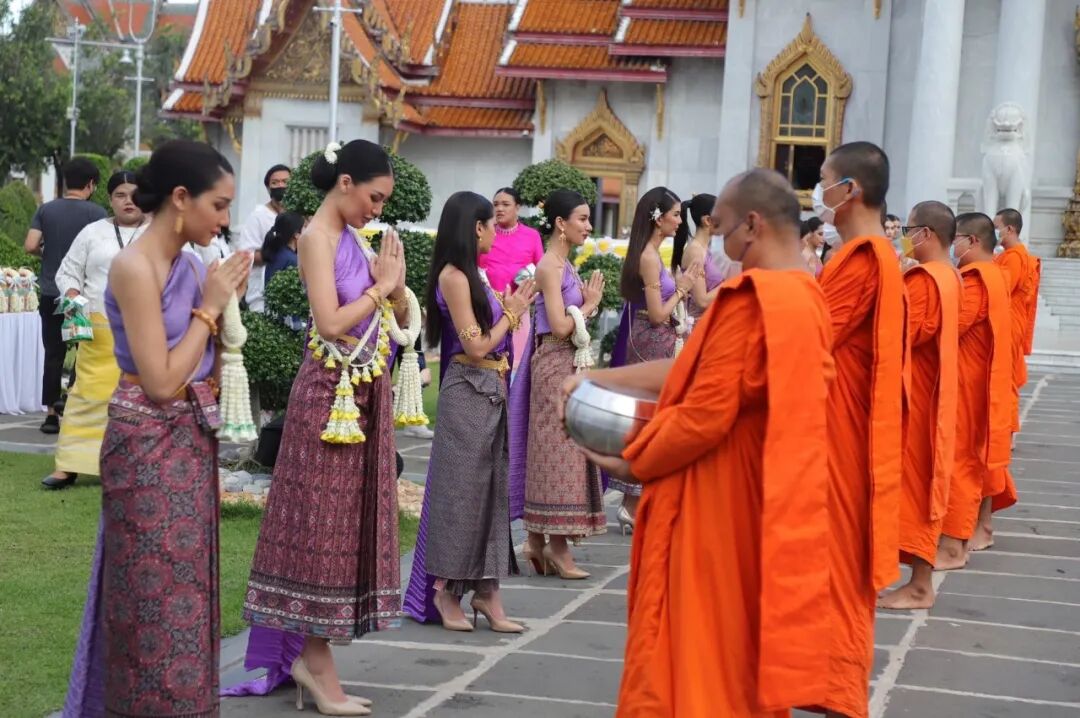 本周一,2022泰国环球小姐的决赛选手们在曼谷某寺庙向僧侣进行布施。
