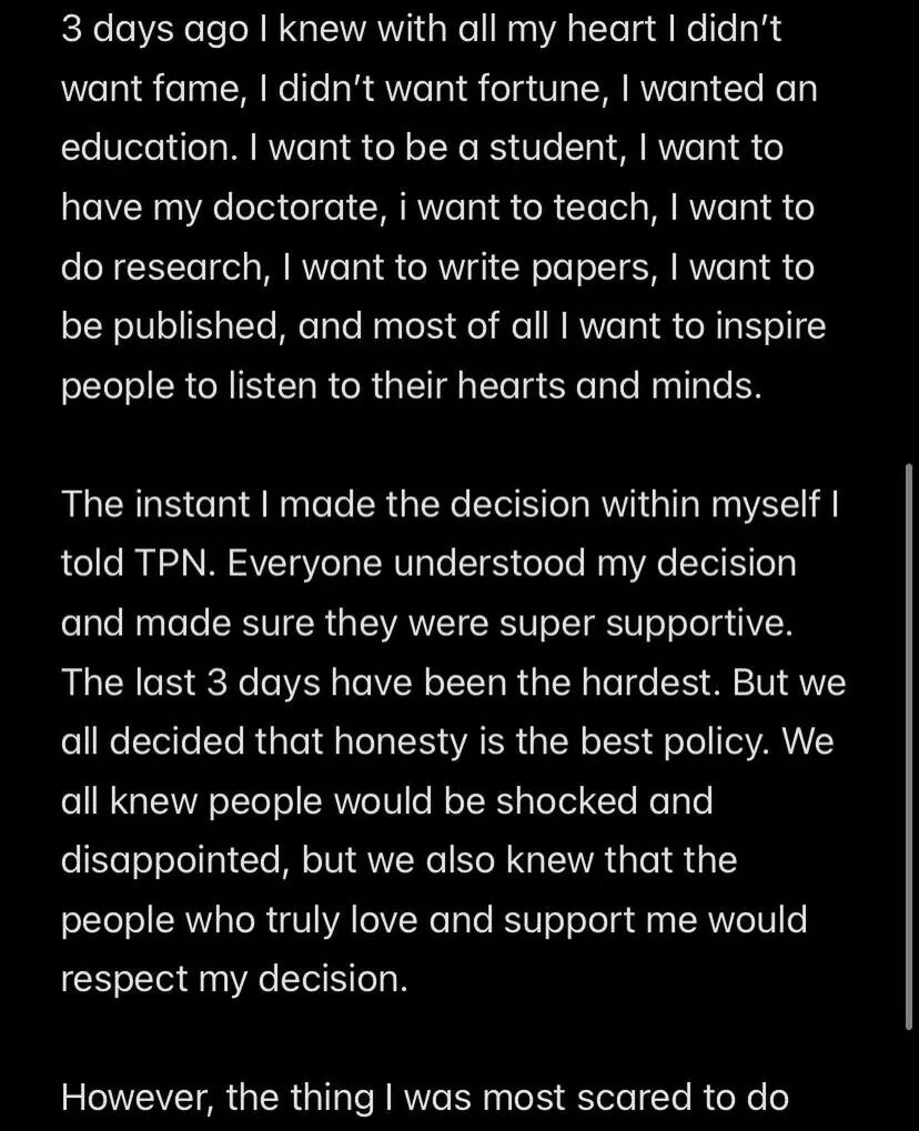 这位妹子决定退出比赛,继续哈佛大学的读博计划。因为如果继续参赛的话,决胜者需要与公司签订一份为期两年的工作合同,这样就不能继续读书了。
