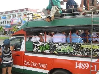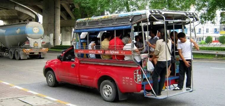 仔细回想,泰国道路上皮卡车当公车用的情况比比皆是,尤其是市区开往旅游景点路线的车辆,常常坐着一车走流浪嬉皮风的farang,他们大都是“包车”去老虎园或某瀑布的欧美游客。