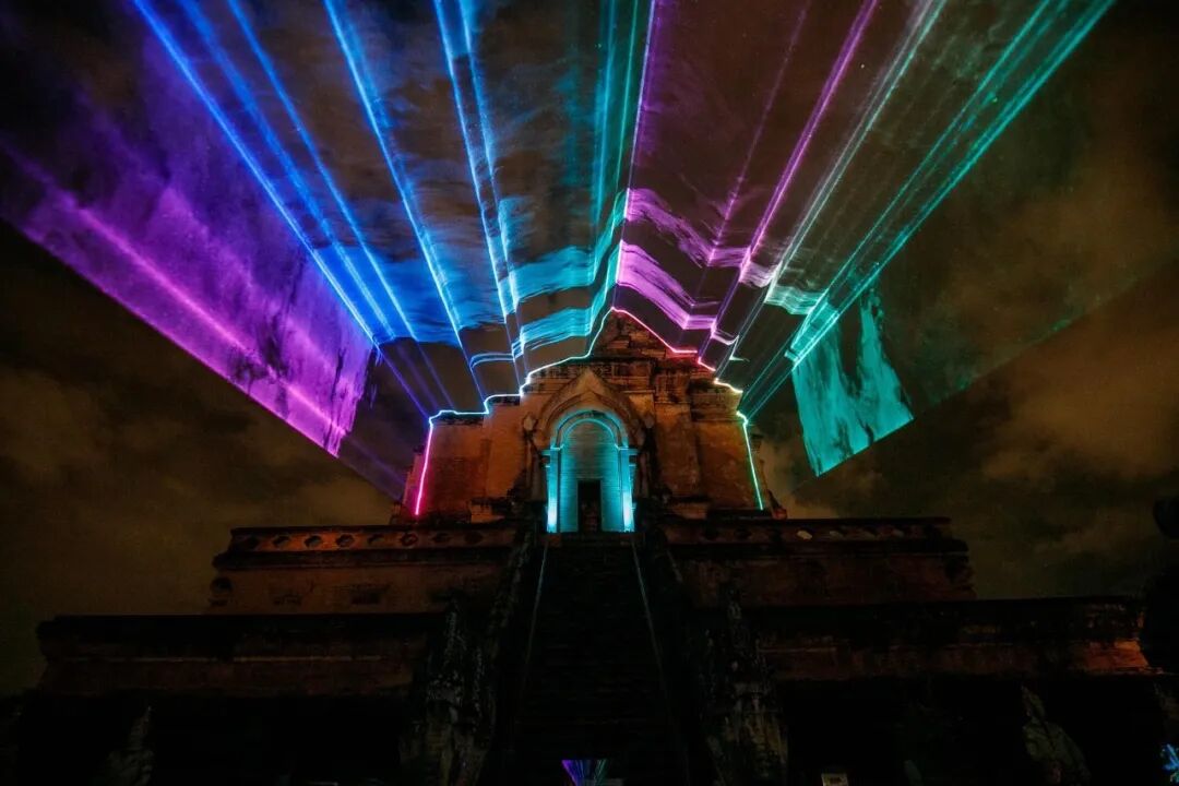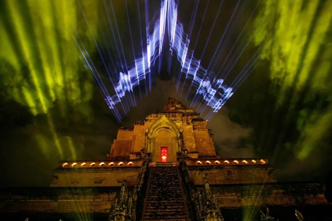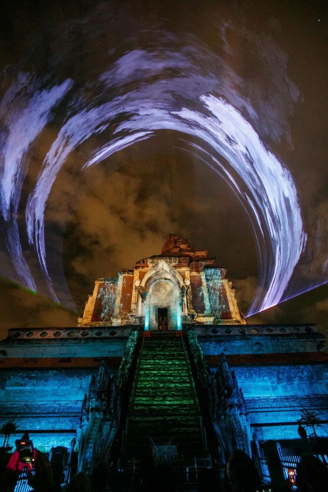 想看看清迈柴迪龙寺(Wat Chedi Luang)被彩色灯光“妆点”后的样子吗?
