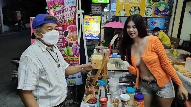 她叫Aranya Apiso(或Nong Olive),在清迈Jed Yod某家小吃店工作。由于着装大胆、暴露、前卫、性感,TIMES君暂且总结为“以乳卖乳”吧……快速在同类店铺中脱颖而出。