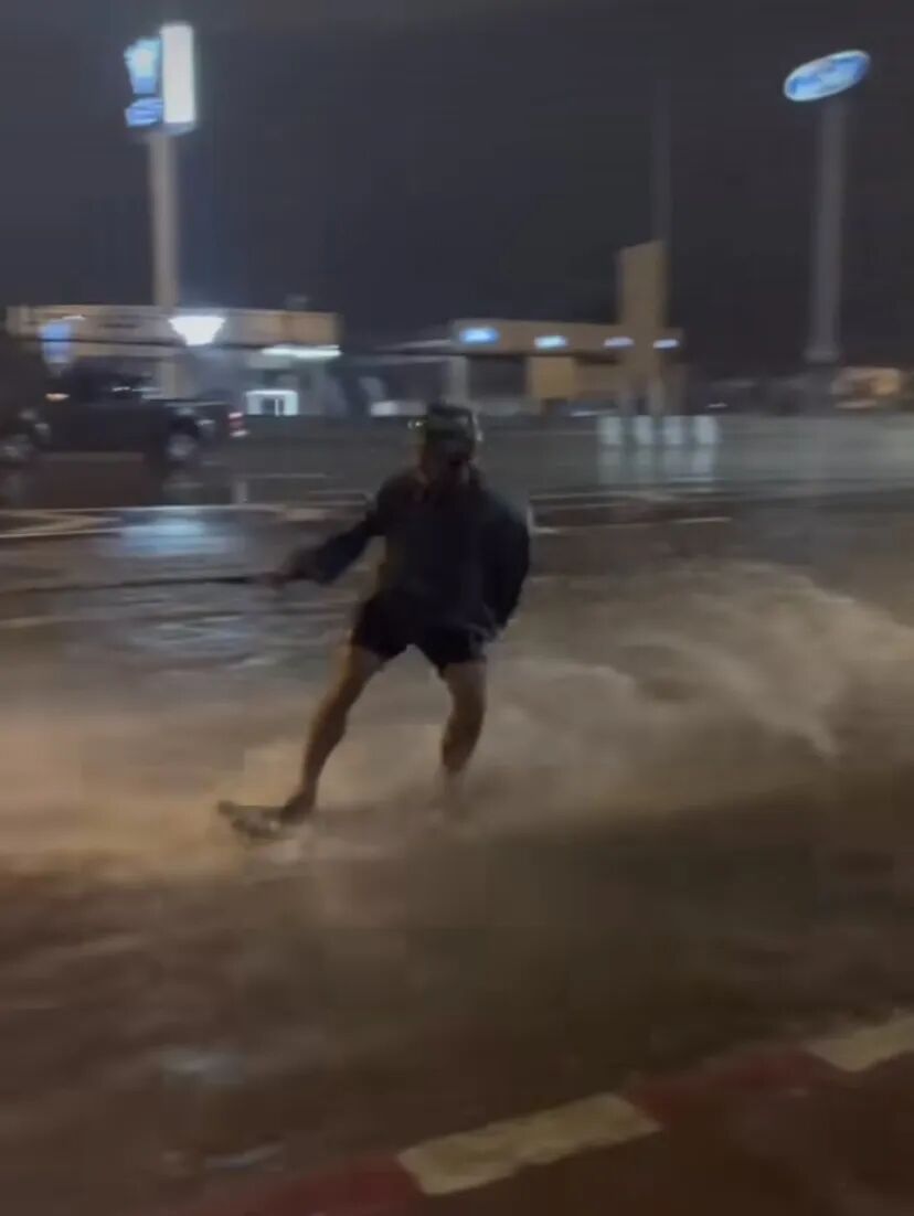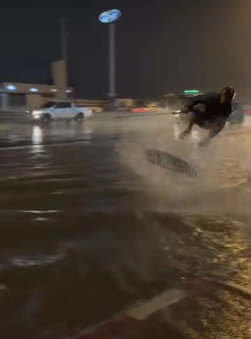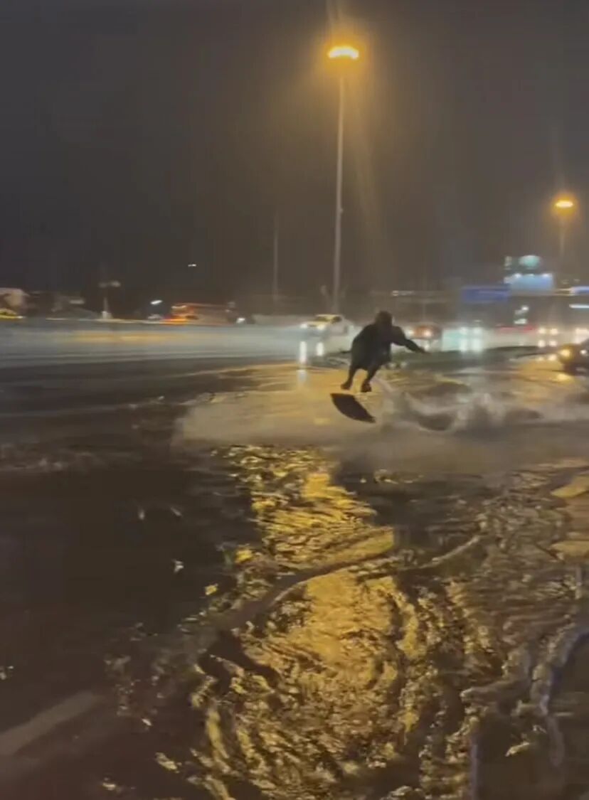 不得不说看起来真的很酷。洪水本是件坏事,但是到了这位把水上滑板看得跟生命一样重要的大男孩这里,脏兮兮的路面积水竟然变成了水上乐园。