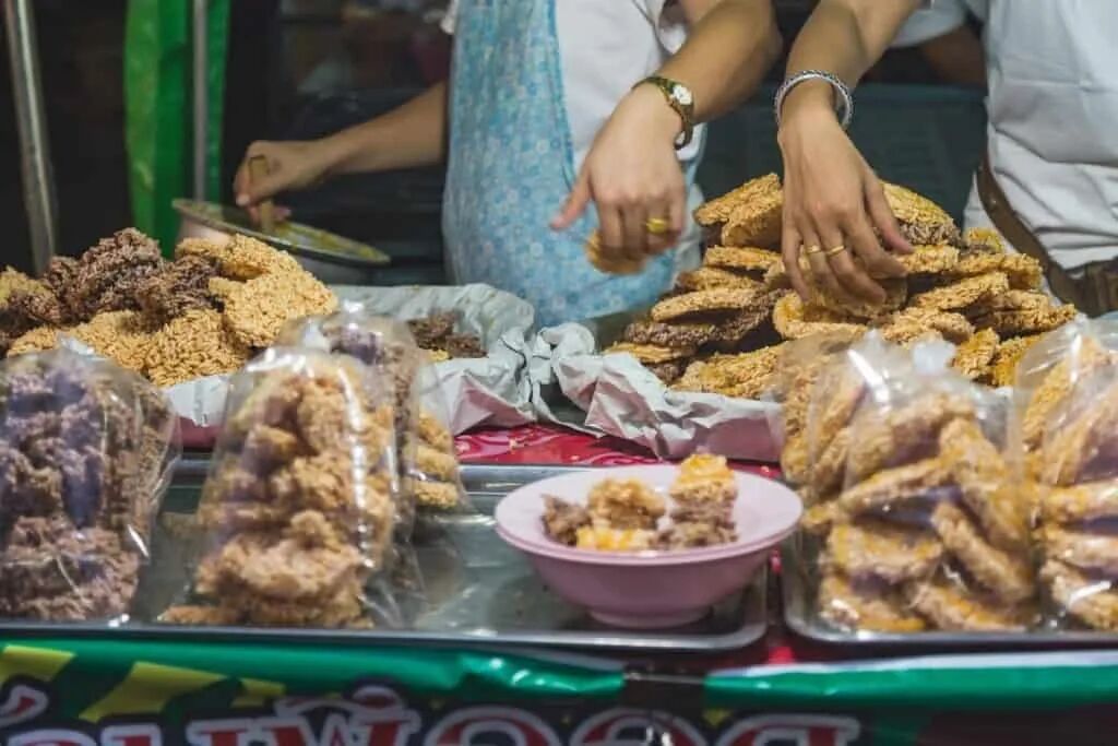 另外还有下图这种外头沾一个小红点的糕点,里面是红豆馅儿、芋头馅儿之类的,可以理解成泰国版红豆饼吧。