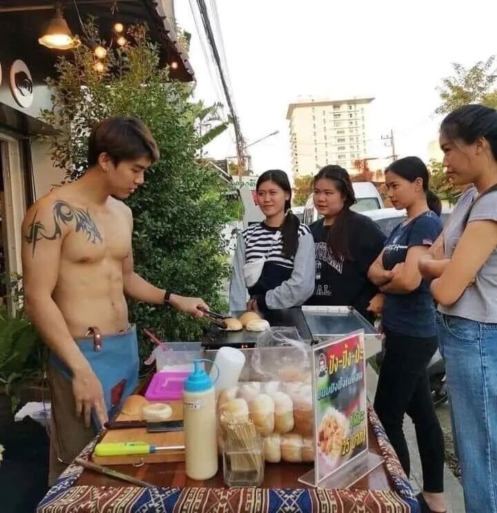 清迈著名博主蒙面男在探店后也写了点评,他配文“我不能说这好不好吃,我只是坐在那里看,看起来很好吃,店里大多数顾客都是男性。” 男性听着幽默,其实很多女孩听了心里应该有不适。