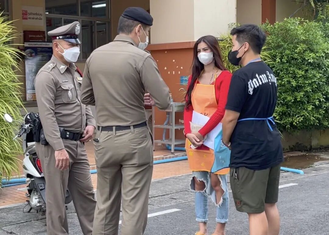 11月25日下午,清迈警察局的执法人员来到了Olive的店里对她进行了思想教育工作。警察表示,目前清迈仍属于新冠肺炎爆发敏感期,从事餐饮行业的Olive应该在制作食品时做好防护措施,例如与客人保持安全距离,带上帽子和口罩。当然,还要穿上围裙。