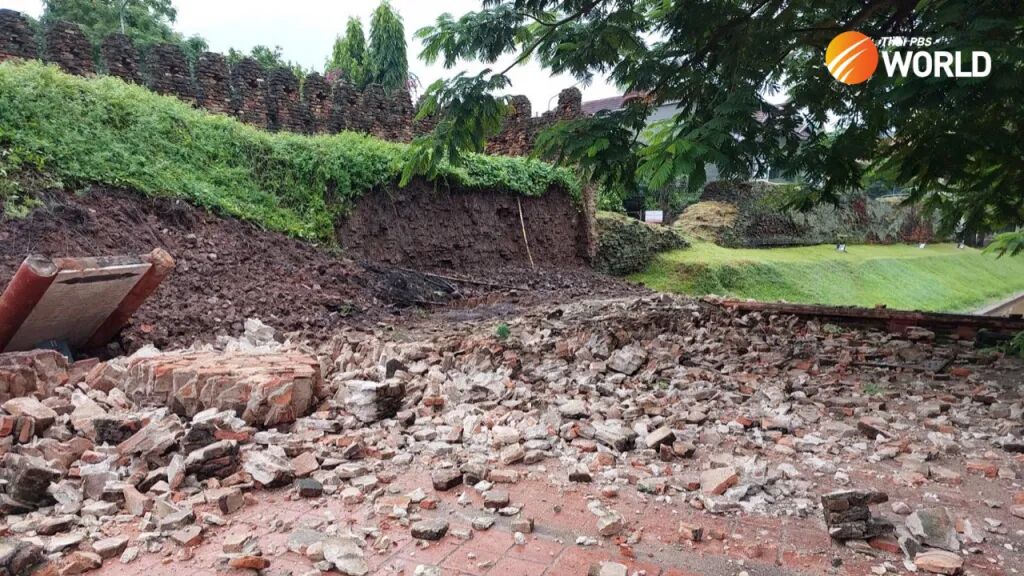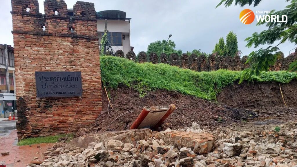 近日的大雨导致清迈古城菖蒲门部分坍塌。