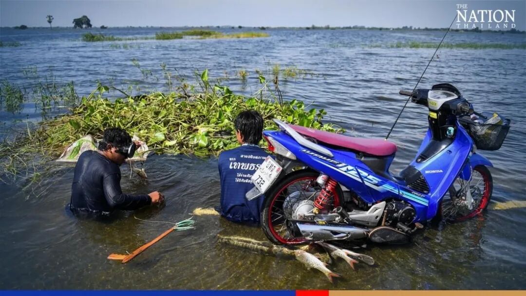 同样被大雨袭击的大城府,有些小伙子就索性做起了捕鱼生意,趁雨天捞点鱼去卖!