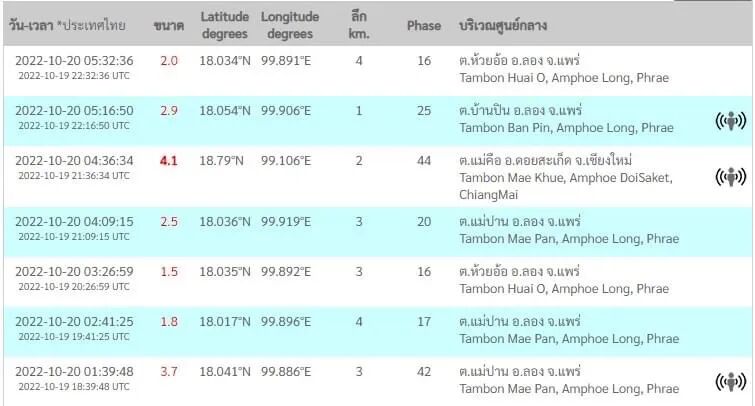 第一次地震发生在凌晨1点39分,为里氏3.7级,震中在Phrae府Long区的Mae Pan。