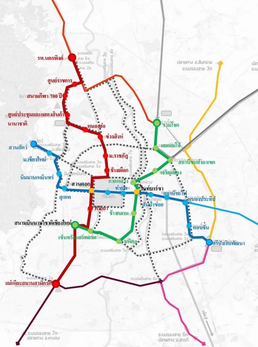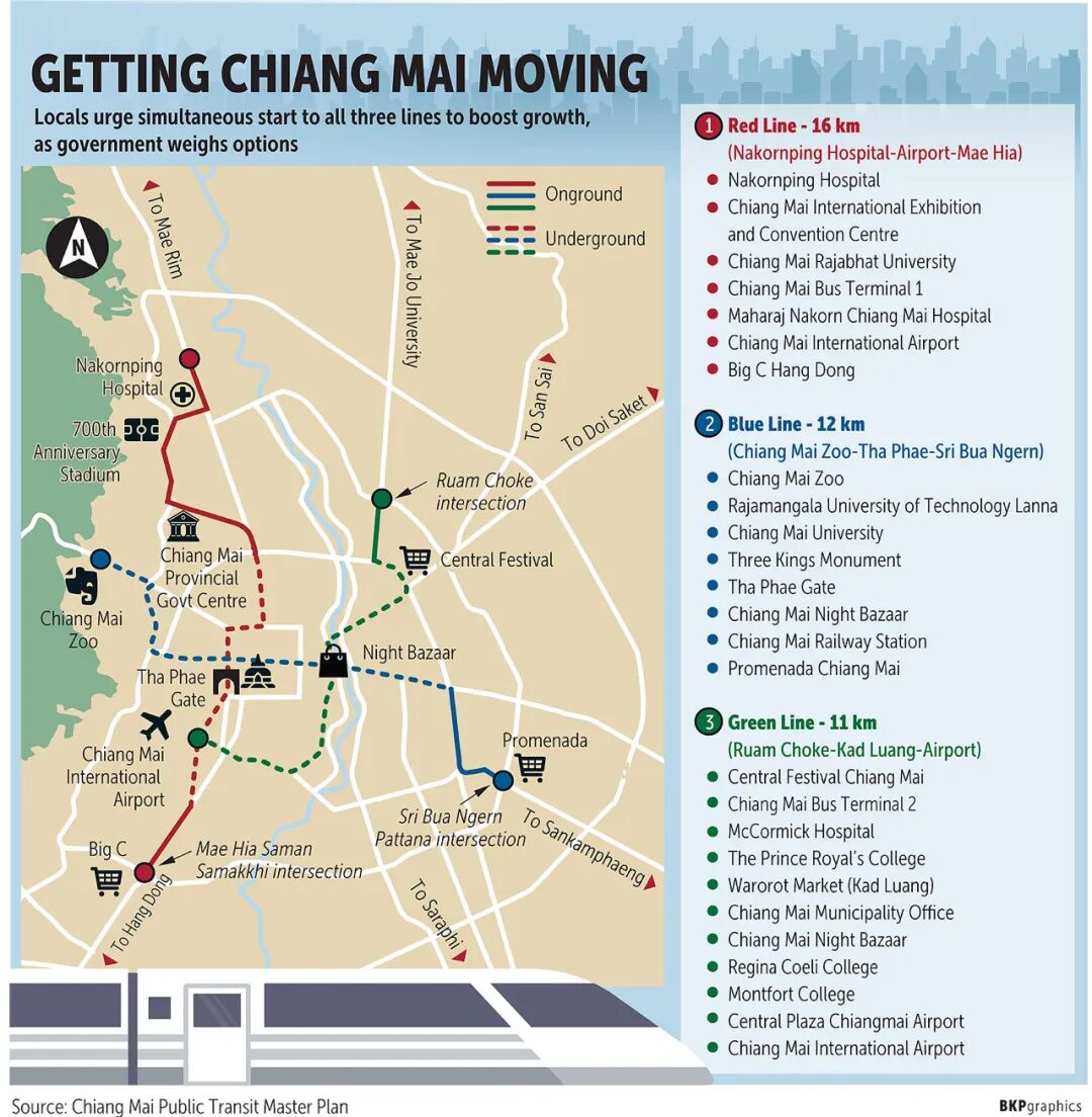 按照MRTA的老计划,清迈的轨道交通共分为3条主线,用颜色标记分别为:红线、蓝线、绿线。