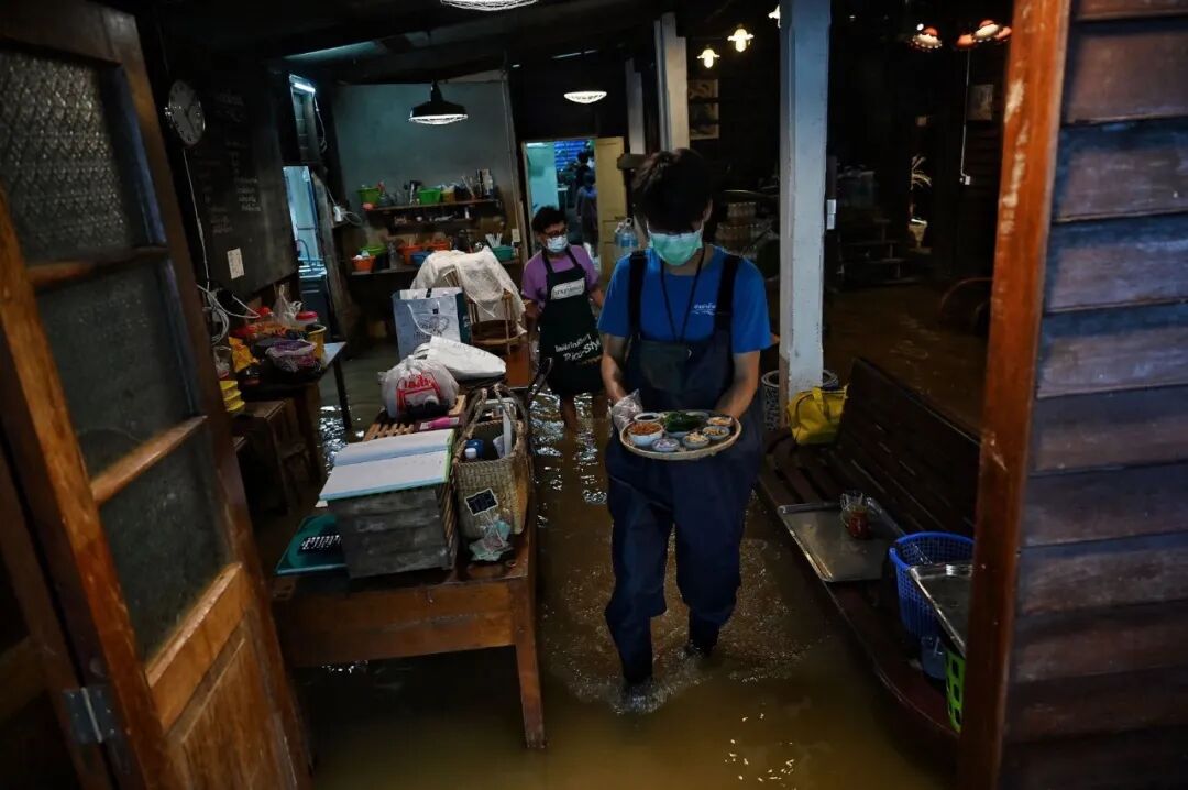 洪水刚开始时,老板Titiporn Jutimanon是想马上暂停营业的。但是他很快就意识到就算店铺被水淹了,其实顾客并不在乎,他们不介意坐在一个被水包围的地方吃饭。